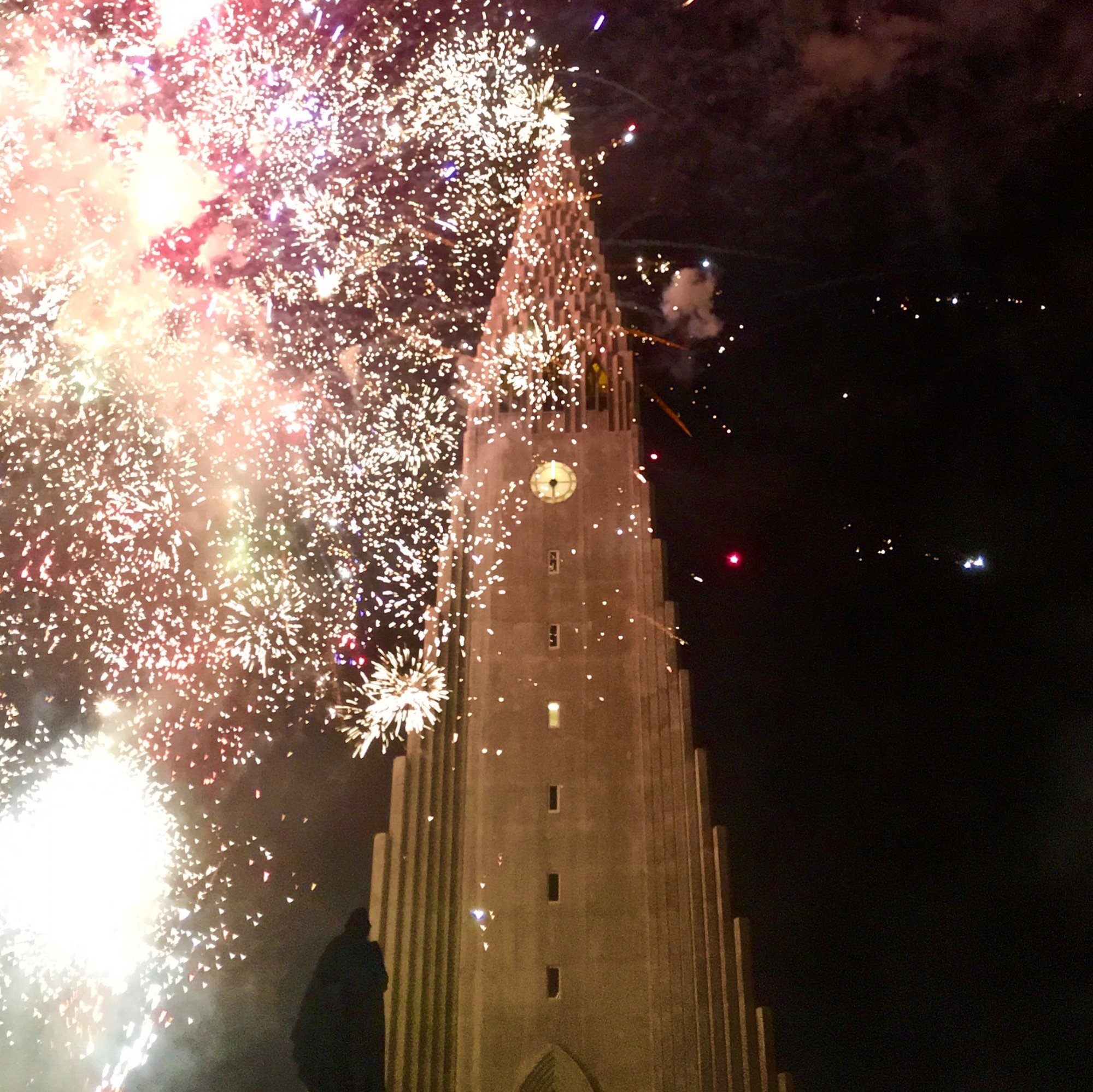 New Year's Fireworks at Hallgrímskrikja in Reykjavík, Iceland