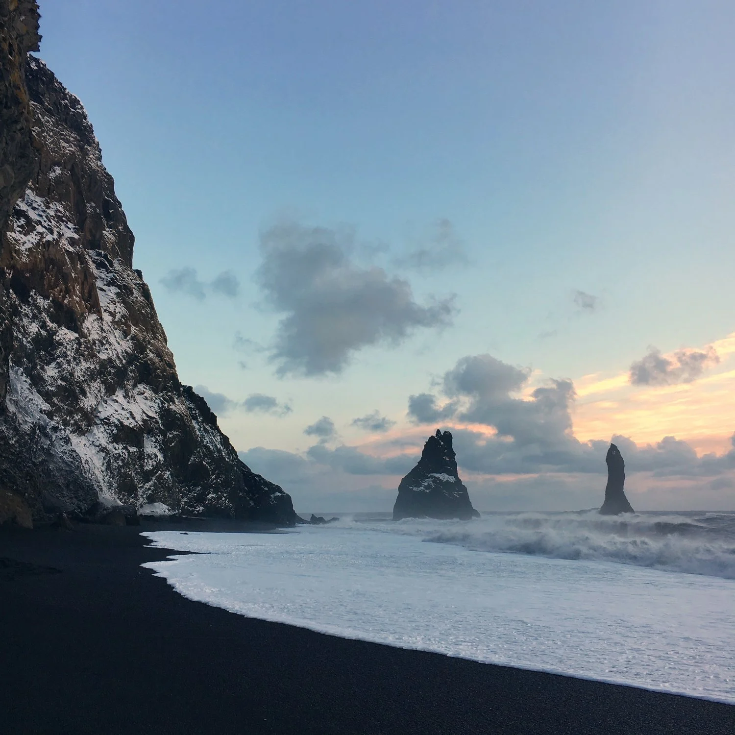 As soon as we got there, however, our fears were replaced by awe. It was one of the most stunning sights I have ever seen. The jet black sand contrasting with the optic white snow, the wintery evening light casting an unreal glow over it all. And looking further up the coast, you could see cliffs made of the same black basalt lava, as well as caves with geometrical black basalt columns, seeming like a landscape from another world. Off shore are the Reynisdrangar sea stacks, a series of tall craggy rocks, shaped like some kind of ancient ruins, that stand starkly alone out in the ocean. Fierce waves were constantly crashing into these stacks, creating an eerie atmosphere that made you feel like you were part of a Viking saga. I found myself imagining these deadly waves and rocks to be what Iceland’s early settlers had to fight their way through to reach land.